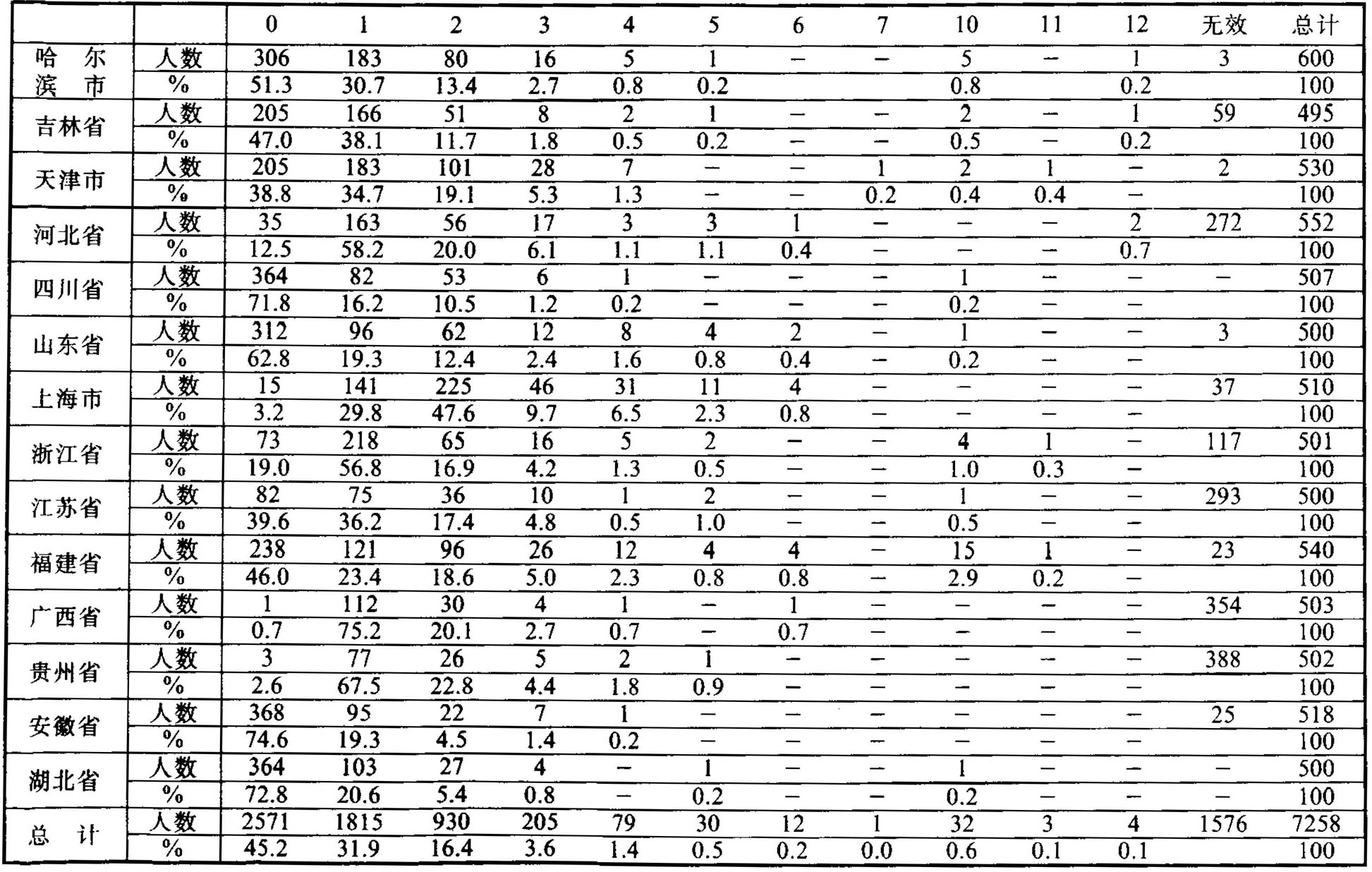- 图片说明:01234567101112无效总计哈尔人数306183801651--5-13600滨市%51.330.713.42.70.80.20.80.2100吉林省人数20516651821--2-159495%47.038.111.71.80.50.2--0.5-0.2100天津市人数205183101287--121-2530%38.834.719.15.31.3--0.20.40.4-100河北省人数351635617331---2272552%12.558.220.06.11.11.10.4---0.7100四川省人数364825361---1---507%71.816.210.51.20.2---0.2--100山东省人数312966212842-1--3500%62.819.312.42.41.60.80.4-0.2--100上海市人数151412254631114----37510%3.229.847.69.76.52.30.8----100浙江省人数73218651652--41-117501%19.056.816.94.21.30.5--1.00.3-100江苏省人数8275361012--1--293500%39.636.217.44.80.51.0--0.5--100福建省人数23812196261244-151-23540%46.023.418.65.02.30.80.8-2.90.2-100广西省人数11123041-1----354503%0.775.220.12.70.7-0.7----100贵州省人数37726521-----388502%2.667.522.84.41.80.9-----100安徽省人数368952271------25518%74.619.34.51.40.2------100湖北省人数364103274-1--1---500%72.820.65.40.8-0.2--0.2---100总计人数257118159302057930121323415767258%45.231.916.43.61.40.50.20.00.60.10.1100