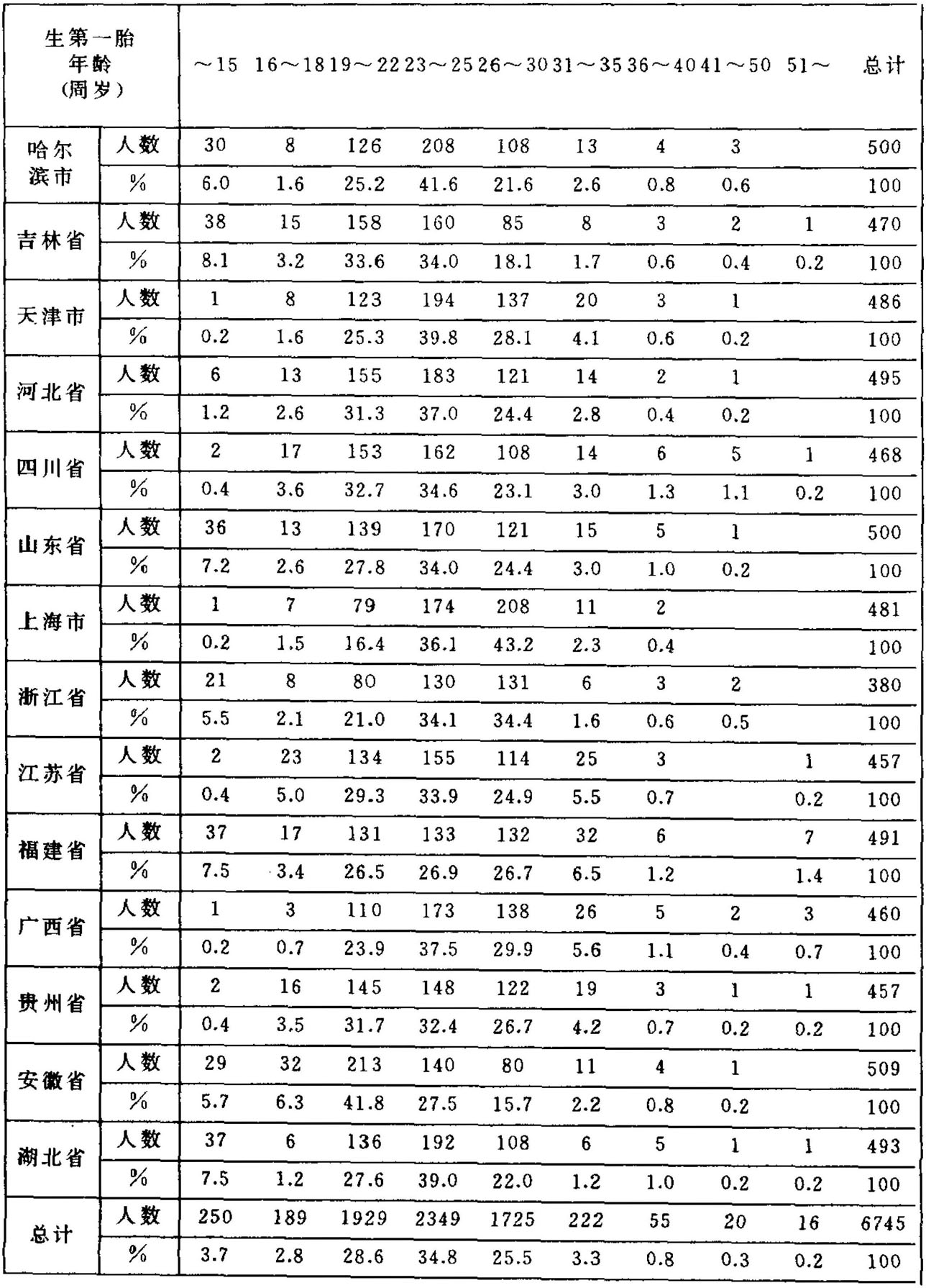 - 图片说明:生第一胎 年龄(周岁)~1516~18 19~22 23~25 26~30 31~35 36~40 41~5051~总计哈尔人数3081262081081343500滨市%6.01.625.241.621.62.60.80.6100吉林省人数3815158160858321470%8.13.233.634.018.11.70.60.40.2100天津市人数181231941372031486%0.21.625.339.828.14.10.60.2100河北省人数6131551831211421495%1.22.631.337.024.42.80.40.2100四川省人数21715316210814651468%0.43.632.734.623.13.01.31.10.2100山东省人数36131391701211551500%7.22.627.834.024.43.01.00.2100上海市人数1779174208112481%0.21.516.436.143.22.30.4100浙江省人数21880130131632380%5.52.121.034.134.41.60.60.5100江苏省人数2231341551142531457%0.45.029.333.924.95.50.70.2100福建省人数37171311331323267491%7.53.426.526.926.76.51.21.4100广西省人数1311017313826523460%0.20.723.937.529.95.61.10.40.7100贵州省人数21614514812219311457%0.43.531.732.426.74.20.70.20.2100安徽省人数2932213140801141509%5.76.341.827.515.72.20.80.2100湖北省人数3761361921086511493%7.51.227.639.022.01.21.00.20.2100总计人数2501891929234917252225520166745%3.72.828.634.825.53.30.80.30.2100