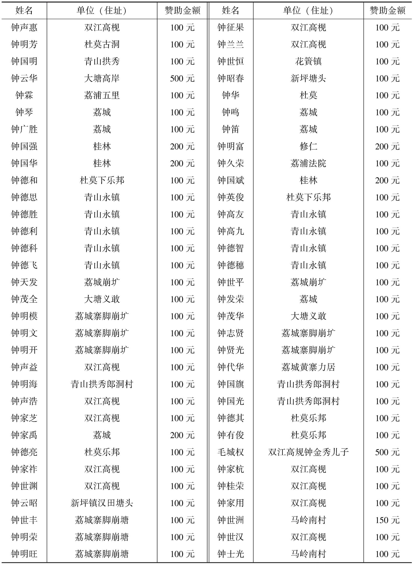 - 图片说明:姓名 单位(住址)赞助金额 姓名 单位(住址)赞助金额钟声惠 双江高枧 100元 钟征果 双江高枧 100元钟明芳 杜莫古洞 100元 钟兰兰 双江高枧 100元钟国明 青山拱秀 100元 钟世恒 花篢镇 100元钟云华 大塘高岸 500元 钟昭春 新坪塘头 100元钟霖 荔浦五里 100元 钟华 杜莫 100元钟琴 荔城 100元 钟鸣 荔城 100元钟广胜 荔城 100元 钟笛 荔城 100元钟国强 桂林 200元 钟明富 修仁 200元钟国华 桂林 200元 钟久荣 荔浦法院 100元钟德和 杜莫下乐邦 100元 钟国斌 桂林 200元钟德思 青山永镇 100元 钟英俊 杜莫下乐邦 100元钟德胜 青山永镇 100元 钟高友 青山永镇 100元钟德利 青山永镇 100元 钟高九 青山永镇 100元钟德科 青山永镇 100元 钟德智 青山永镇 100元钟德飞 青山永镇 100元 钟德穗 青山永镇 100元钟天发 荔城崩圹 100元 钟世平 荔城崩圹 100元钟茂全 大塘义敢 100元 钟发荣 荔城 100元钟明模 荔城寨脚崩圹 100元 钟茂华 大塘义敢 100元钟明文 荔城寨脚崩圹 100元 钟志贤 荔城寨脚崩圹 100元钟明开 荔城寨脚崩圹 100元 钟贤光 荔城寨脚崩圹 100元钟声益 双江高枧 100元 钟代华 荔城黄寨力居 100元钟明海 青山拱秀郎洞村 100元 钟国旗 青山拱秀郎洞村 100元钟声浩 双江高枧 100元 钟国光 青山拱秀郎洞村 100元钟家芝 双江高枧 100元 钟德其 杜莫乐邦 100元钟家禹 荔城 200元 钟有俊 杜莫乐邦 100元钟德亮 杜莫乐邦 100元 毛城权 双江高规钟金秀儿子 500元钟家祚 双江高枧 100元 钟家杭 双江高枧 100元钟世渊 双江高枧 100元 钟桂荣 双江高枧 100元钟云昭 新坪镇汉田塘头 100元 钟家用 双江高枧 100元钟世丰 荔城寨脚崩塘 100元 钟世洲 马岭南村 150元钟明荣 荔城寨脚崩塘 100元 钟世汉 双江高枧 100元钟明旺 荔城寨脚崩塘 100元 钟士光 马岭南村 100元