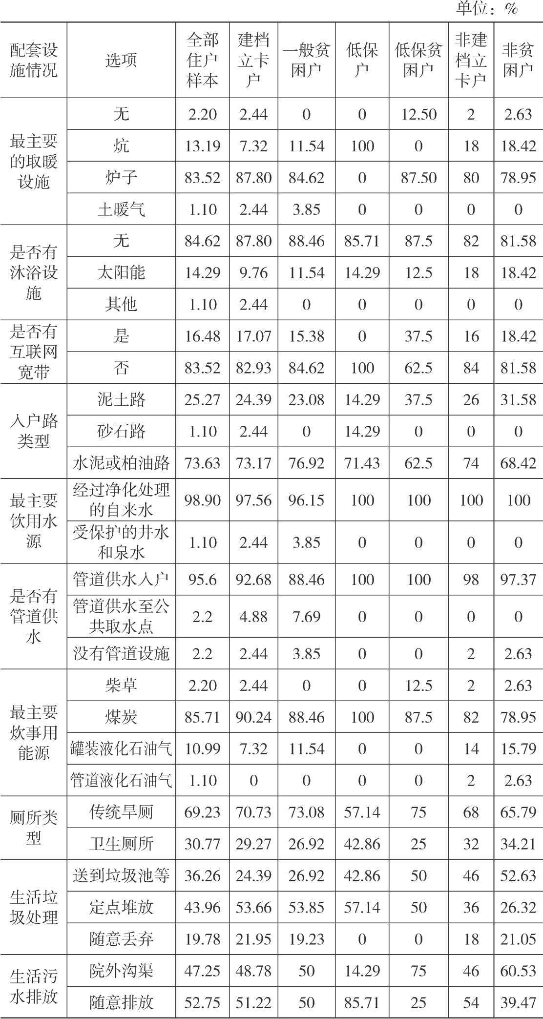 - 图片说明:单位:%配套设施情况选项全部住户样本建档立卡户一般贫困户低保户低保贫困户非建档立卡户非贫困户最主要的取暖设施无2.202.440012.5022.63炕13.197.3211.5410001818.42炉子83.5287.8084.62087.508078.95土暖气1.102.443.850000是否有沐浴设施无84.6287.8088.4685.7187.58281.58太阳能14.299.7611.5414.2912.51818.42其他1.102.4400000是否有互联网宽带是16.4817.0715.38037.51618.42否83.5282.9384.6210062.58481.58入户路类型泥土路25.2724.3923.0814.2937.52631.58砂石路1.102.44014.29000水泥或柏油路73.6373.1776.9271.4362.57468.42最主要饮用水源经过净化处理的自来水98.9097.5696.15100100100100受保护的井水和泉水1.102.443.850000是否有管道供水管道供水入户95.692.6888.461001009897.37管道供水至公共取水点2.24.887.690000没有管道设施2.22.443.850022.63最主要炊事用能源柴草2.202.440012.522.63煤炭85.7190.2488.4610087.58278.95罐装液化石油气10.997.3211.54001415.79管道液化石油气1.10000022.63厕所类型传统旱厕69.2370.7373.0857.14756865.79卫生厕所30.7729.2726.9242.86253234.21生活垃圾处理送到垃圾池等36.2624.3926.9242.86504652.63定点堆放43.9653.6653.8557.14503626.32随意丢弃19.7821.9519.23001821.05生活污水排放院外沟渠47.2548.785014.29754660.53随意排放52.7551.225085.71255439.47