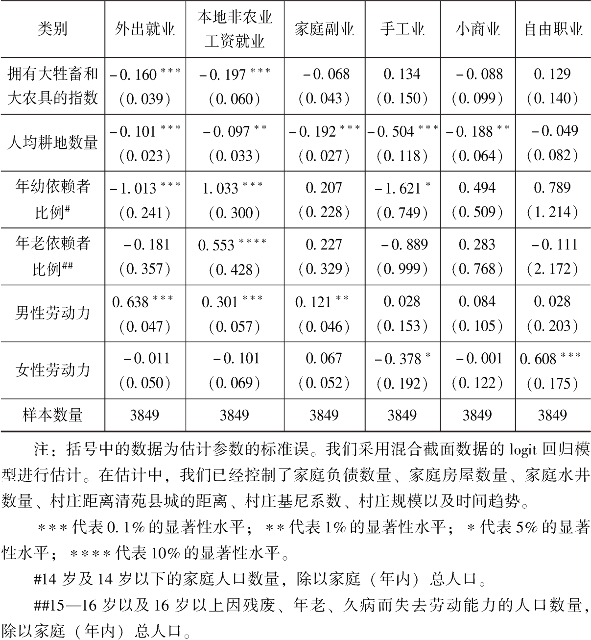 - 图片说明:类别 外出就业 本地非农业工资就业 家庭副业 手工业 小商业 自由职业拥有大牲畜和大农具的指数 -0.160***(0.039) -0.197***(0.060) -0.068(0.043) 0.134(0.150) -0.088(0.099) 0.129(0.140)人均耕地数量 -0.101***(0.023) -0.097**(0.033) -0.192***(0.027) -0.504***(0.118) -0.188**(0.064) -0.049(0.082)年幼依赖者比例# -1.013***(0.241) 1.033***(0.300) 0.207(0.228) -1.621*(0.749) 0.494(0.509) 0.789(1.214)年老依赖者比例## -0.181(0.357) 0.553****(0.428) 0.227(0.329) -0.889(0.999) 0.283(0.768) -0.111(2.172)男性劳动力 0.638***(0.047) 0.301***(0.057) 0.121**(0.046) 0.028(0.153) 0.084(0.105) 0.028(0.203)女性劳动力 -0.011(0.050) -0.101(0.069) 0.067(0.052) -0.378*(0.192) -0.001(0.122) 0.608***(0.175)样本数量 3849 3849 3849 3849 3849 3849 注:括号中的数据为估计参数的标准误。我们采用混合截面数据的logit回归模型进行估计。在估计中,我们已经控制了家庭负债数量、家庭房屋数量、家庭水井数量、村庄距离清苑县城的距离、村庄基尼系数、村庄规模以及时间趋势。***代表0.1%的显著性水平;**代表1%的显著性水平;*代表5%的显著性水平;****代表10%的显著性水平。#14岁及14岁以下的家庭人口数量,除以家庭(年内)总人口。##15—16岁以及16岁以上因残废、年老、久病而失去劳动能力的人口数量,除以家庭(年内)总人口。